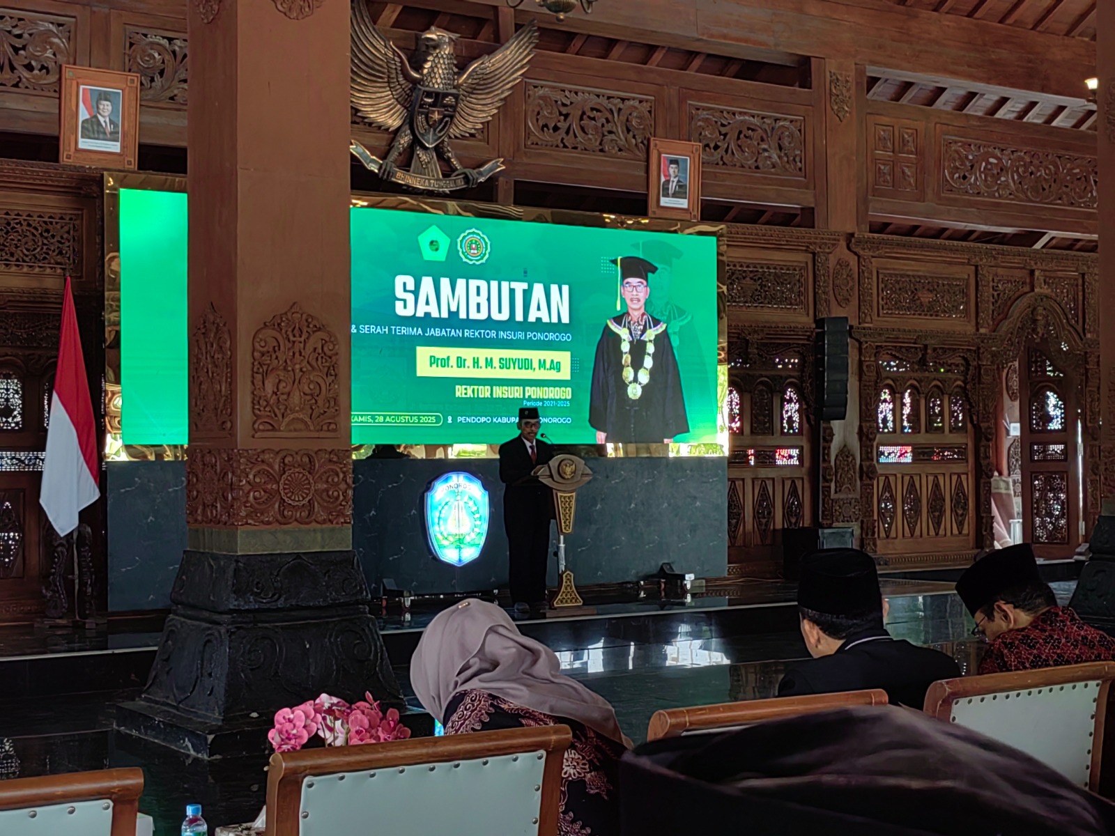 NU Online Ponorogo – Institut Agama Islam Sunan Giri (INSURI) Ponorogo menggelar prosesi pergantian rektor di Pendopo Agung Kabupaten Ponorogo (28/08). Acara ini menandai berakhirnya masa jabatan Prof. Dr. H. Suyudi, M.Ag sebagai Rektor periode 2021–2025, sekaligus pelantikan Dr. K. Muhammad Asvin Abdur Rohman, M. Pd. I sebagai Rektor baru periode 2025–2029.